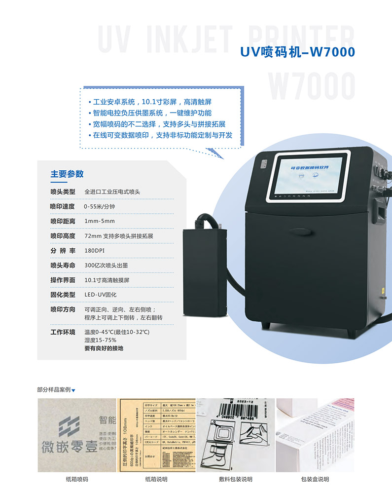 1参数信息产品型号W5000喷码机喷头参数l 喷头类型:全进口工业压电喷头l 喷头材质:全钢l 喷嘴数量:1280个l 喷嘴列间距:0.55mml 喷嘴间距:约0.1693mm/列l 墨滴:7~35Pl可变墨滴l 喷嘴排数:4排l 最大喷印宽度:54.1mm操作界面尺寸:10.2inch(英寸)触摸屏电阻式触摸屏、电容式触摸屏硬件接口l USB2.0接口l RS232接口l 固化灯接口l 编码器接口l 触发器接口防护等级IP54工作环境l 工作温度:0℃-45℃(最佳10℃-32℃)l 湿度:15%-75%l 防护要求:要有良好的接地产品规格l 结构:不锈钢外壳l 电源:AC220V/50HZl 系统功耗:最大功耗120Wl 设备重量:约30kgl 机器尺寸:630*450*300mml 喷头尺寸:360*125*50mm技术参数l 喷头寿命:300亿次喷头出